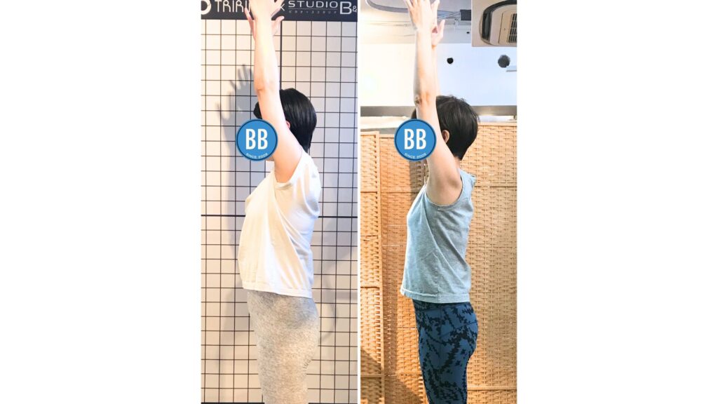 下記の写真は、ご入会から約半年後・25回目のセッション前後の姿勢を比較した一枚です。